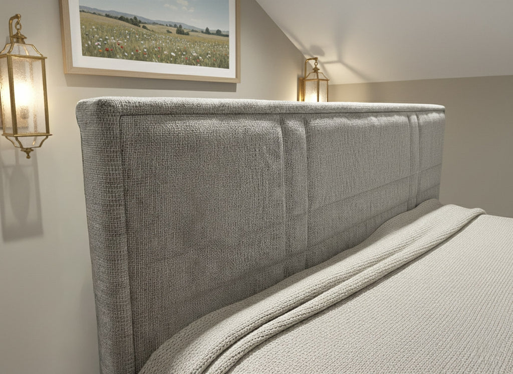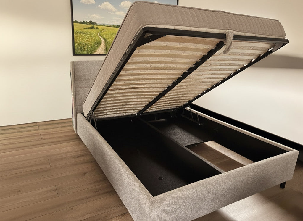 Pat cu mecanism de ridicare, are somiera dezmembrabilă, lada de depozitare din stofa tehnică fibertex, piciorușe din lemn, vopsite în culoarea nucului.