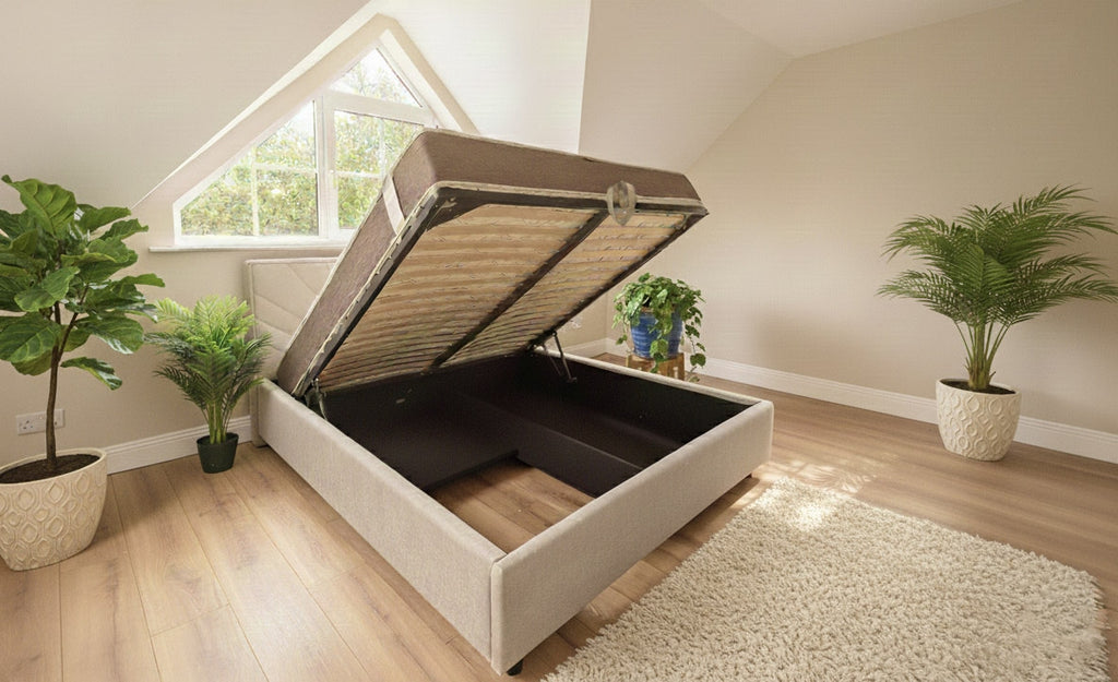 Pat cu mecanism de ridicare, are somiera dezmembrabilă, lada de depozitare din stofa tehnică fibertex, piciorușe din lemn, vopsite în culoarea nucului.